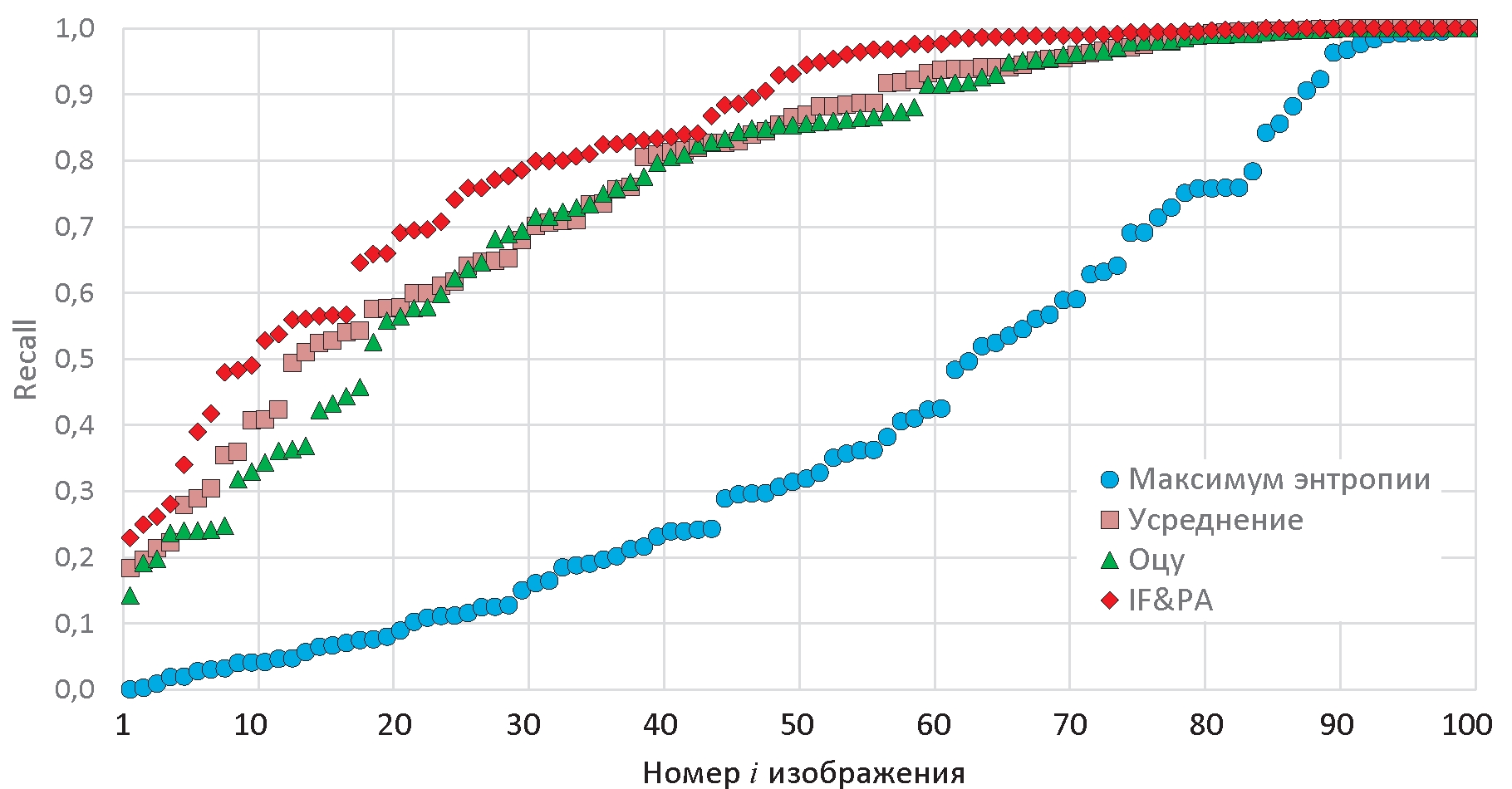 Рис. 10. Графики упорядоченных значений показателя Recall для изображений i=1, …, 100, обработанных методами максимума энтропии (синий), усреднения (желтый), Оцу (зеленый) и IF&PA (красный)