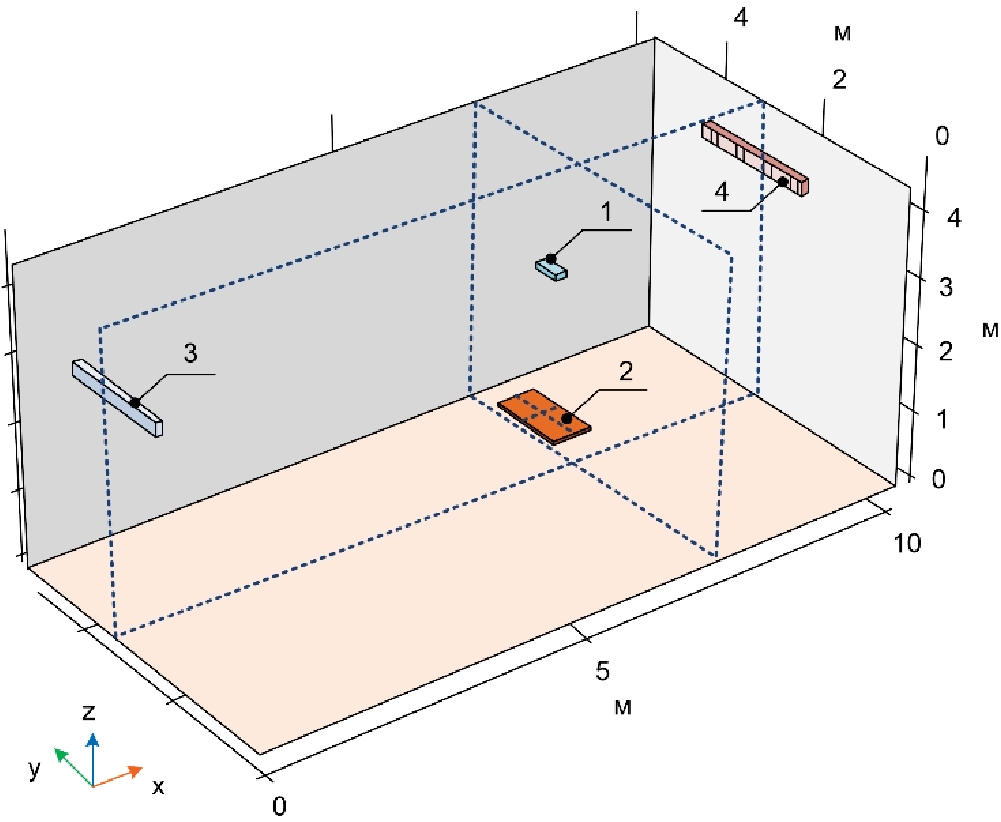 Для проведения математического моделирования в трехмерной постановке рассмотрено помещение известных размеров Lx=10×Ly=5×Lz=4,4 м. Толщина ограждающих конструкций (стен, пола и потолка) данного помещения принята как Lwall=0,1 м. В рассматриваемом помещении выделена локальная рабочая зона, в которой находится горизонтальная панель (размеры Lxtb=0,6 м, Lytb=1,2 м, Lztb=0,05 м), имитирующая оборудование. Поверхность горизонтальной панели располагалась на оси симметрии ГИИ на высоте 760 мм от пола. Выделенная локальная рабочая зона обогревается ГИИ (размеры LxGIE =0,164 м, LyGIE=0,4 м, LzGIE=0,1 м), расположенным на высоте 2,975 м. В помещении также расположена система воздухообмена. Месторасположение элементов рассматриваемой области соответствует наиболее типичному варианту их размещения в реальном производственном помещении, схема которого представлена на рис. 1. При расчете воздух считается диатермичной средой, а все поверхности (стен, пола, потолка, ГИИ и оборудования) – непрозрачными серыми. Основные характеристики материалов элементов (объектов) конструкции приведены в таблице.