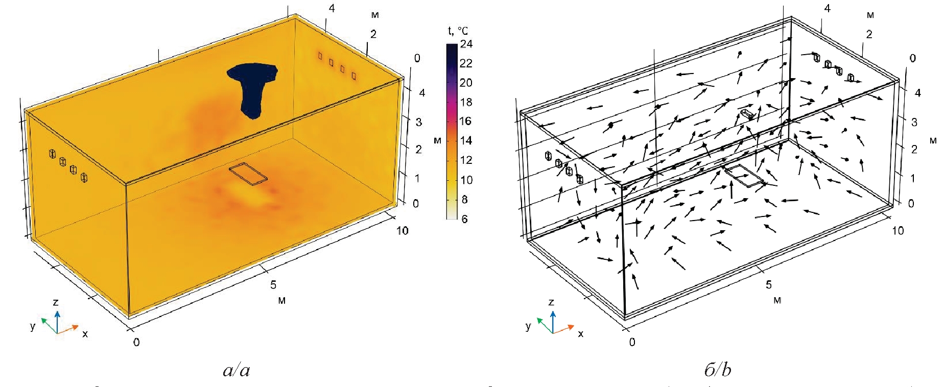 Рис. 2. Распределение температур на поверхностях ограждающих конструкций и область с температурой воздуха 24 ℃ (а) и векторное поле движения воздуха в рассматриваемой области (б) через 60 минут работы газового инфракрасного нагревателя и системы воздухообмена