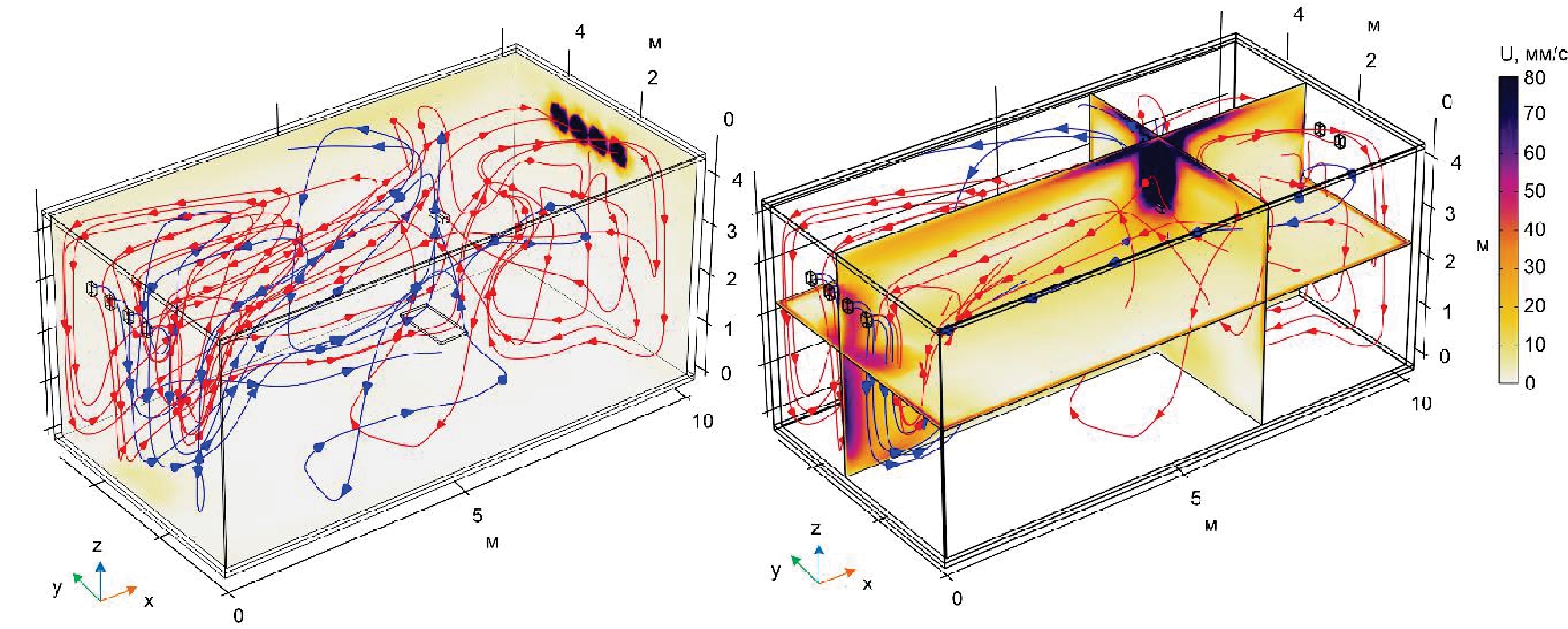 Рис. 4. Поля скоростей и линии тока в сечениях XZ (а) и YZ (а), полученные в результате трехмерного моделирования, через 60 минут работы газового инфракрасного нагревателя и системы воздухообмена