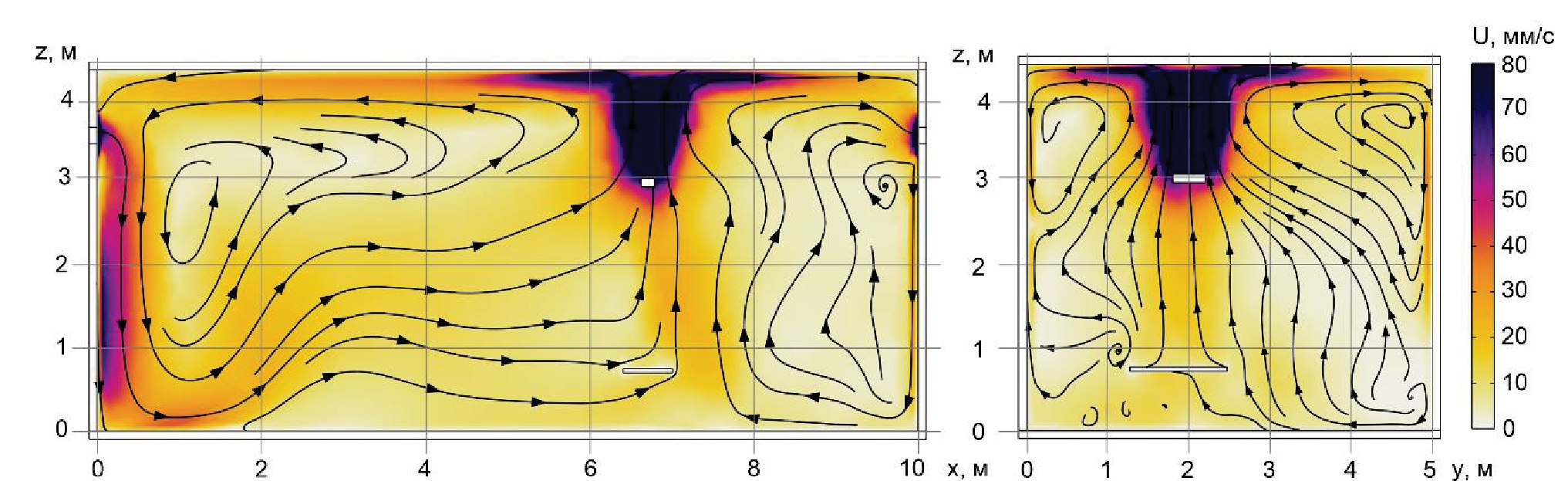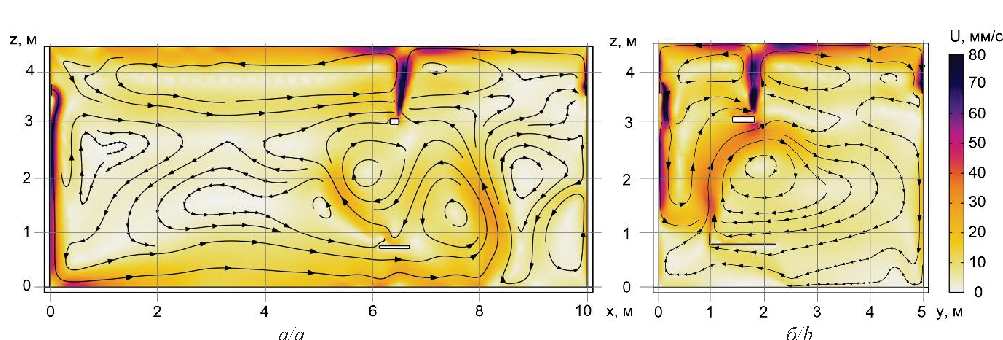 Рис. 5. Поля скоростей и линии тока в сечениях XZ (а) и YZ (а), полученные в результате двухмерного моделирования, через 60 минут работы газового инфракрасного нагревателя и системы воздухообмена