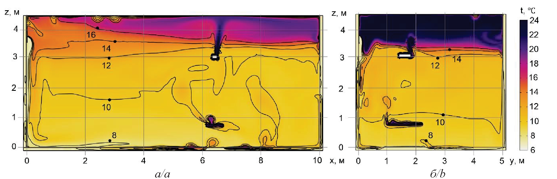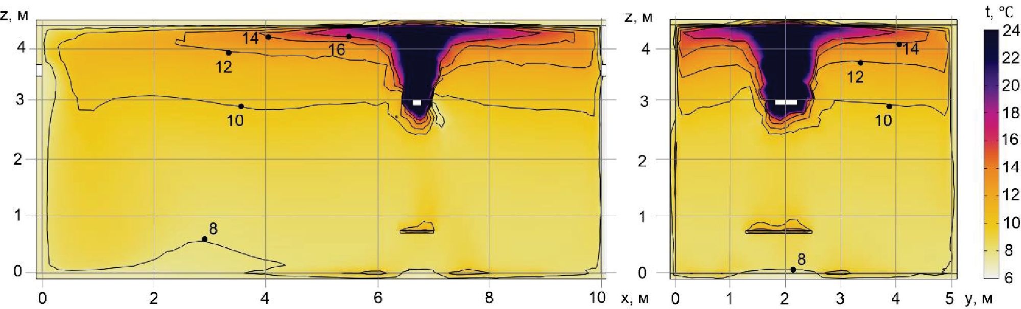 Рис. 7. Поля температур в сечениях XZ (а) и YZ (а), полученные в результате двухмерного моделирования, через 60 минут работы газового инфракрасного нагревателя и системы воздухообмена