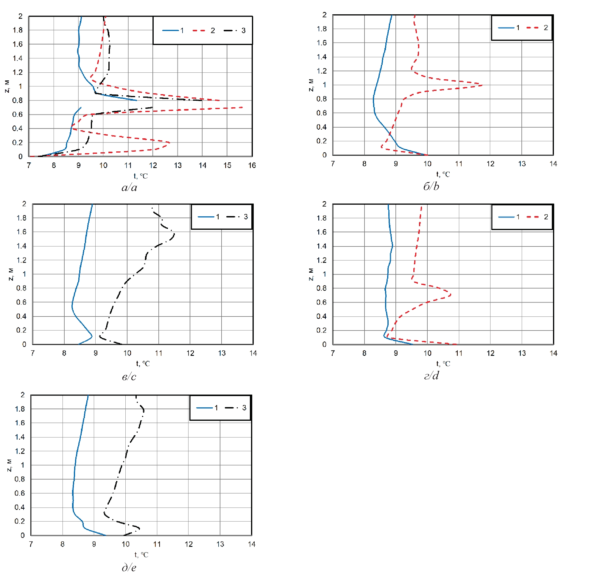 Fig. 8. Air temperature distribution over the section under the gas infrared heater (a) at a distance of 20 cm to the left (b, c) and to the right (d, e) of the panel after 60 minutes of gas infrared heater and supply and exhaust ventilation operation for cases: 1 – three-dimensional modeling; 2 – two-dimensional modeling in XZ axes; 3 – two-dimensional modeling in YZ axes