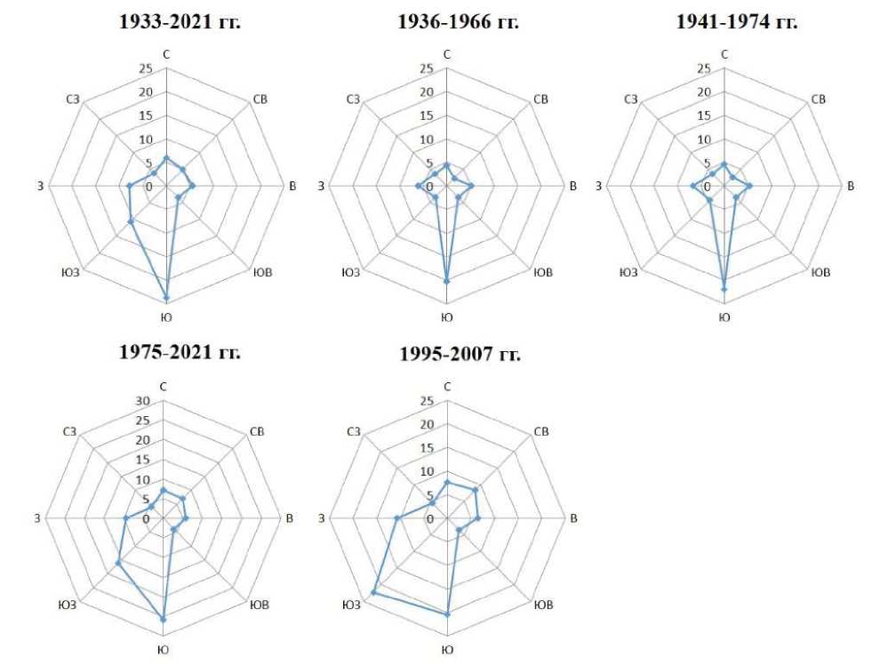 Результаты расчета корреляционного анализа выявили влияние на аккумуляцию ртути северо-восточных и юго-западных ветров в течение года. Юго-западные ветра играют важную роль в поступлении элемента в течение вегетационного периода, при положительных температурах и в течение зимнего периода. Кластерный анализ подтвердил преобладающую роль в атмосферном переносе ртути южного, восточного и западного ветров за год, в течение вегетационного периода, при положительных и отрицательных температурах, а также их продолжительность. Что совпадает с долей ветров этих направлений, о чем свидетельствует роза ветров как за весь период исследования, так и в периоды повышенных концентраций (рис. 5).