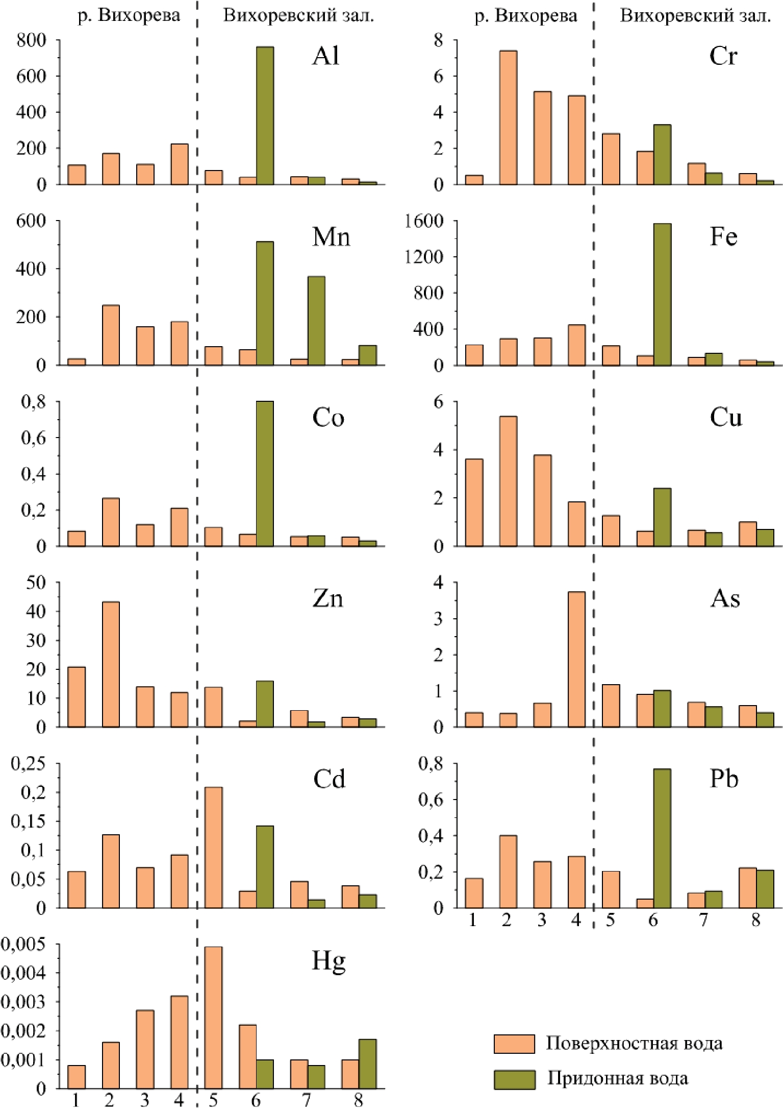 Рис. 4. Концентрации микроэлементов (мкг/л) в водах р. Вихорева и Вихоревского залива