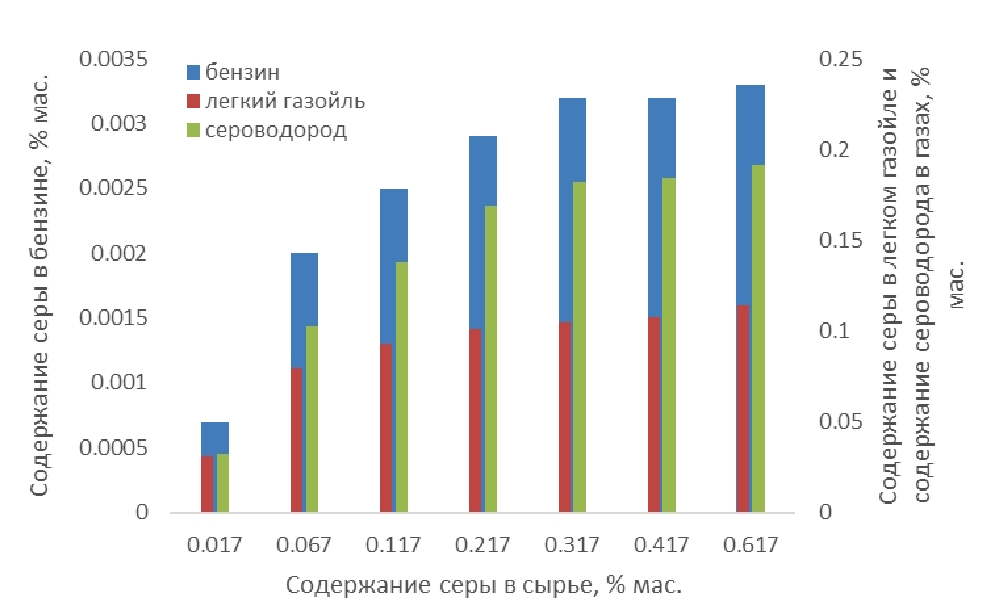 Анализ производственных данных показал, что содержание сернистых соединений в потоке гидроочищенного сырья может изменяться от 0,083 до 0,620 мас. % вследствие, например, дефицита водорода на НПЗ, остановки блока гидроочистки или нарушения его технологического режима работы, что вызывает рост содержания серы в бензиновой фракции каталитического крекинга. Содержание общей серы в бензине при переработке гидроочищенного вакуумного газойля может достигать 0,0118 мас. %, ограничивая тем самым долю бензина крекинга в товарном продукте [1–5]. Стоит отметить, что около 80–85 % серы поступает в товарный бензин с потоком бензина каталитического крекинга.