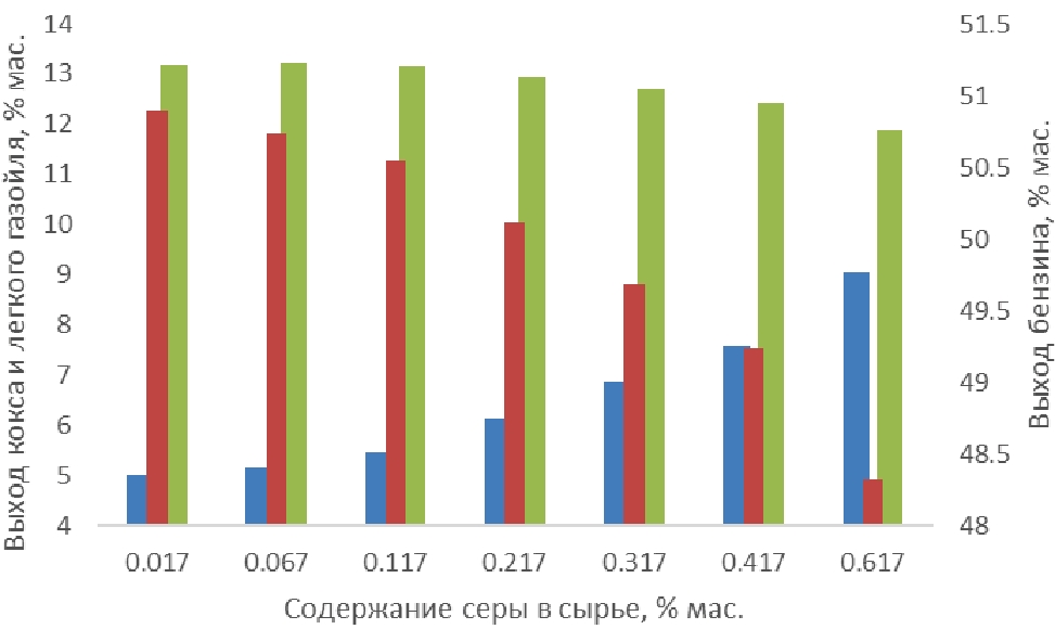 Прогнозные расчеты показали, что при увеличении содержания серы в сырье процесса на 0,60 мас. % содержание серы в бензине и легком газойле увеличивается на 0,0026 и 0,0832 мас. % соответственно. Содержание сероводорода в газах крекинга возрастает более существенно – на 0,1586 мас. % При этом выход кокса возрастает на 4,0 мас. %, а выход бензина и легкого газойля снижается на 2,57 и 1,29 мас. % (рис. 6), что может быть связано с дезактивацией катализатора крекинга вследствие протекания реакций конденсации ароматических и сернистых соединений.