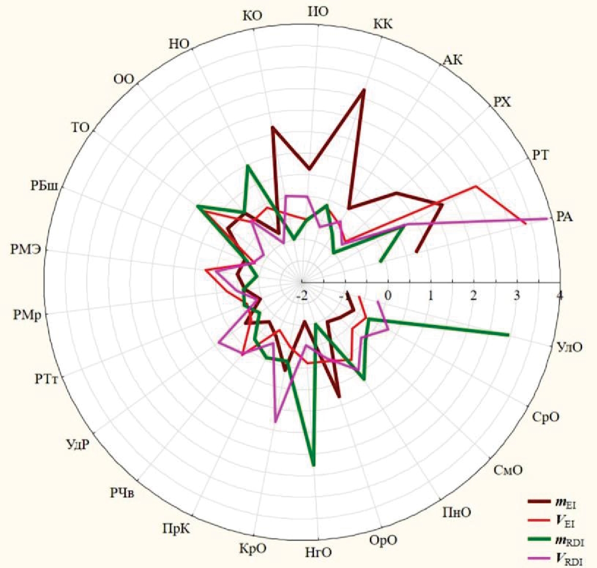 По результатам расчета DEA оценены эффективности (усредненные по регионам и годам) ТЕout=0,503 (по максимизации результата EI0 при фиксированном ресурсе RDI) и ТЕin=0,378 (по минимизации ресурса RDI при фиксированном результате EIO). В результате расчетов выявлено: 1 постоянный (все 13 лет) регион-лидер (НгО) и 6 непостоянных (РТт – 11 лет, РХ – 10 лет, РМЭ – 7 лет, РА– 5 лет, КО – 3 года, ОрО – 1 год) за 2010–2022 гг.