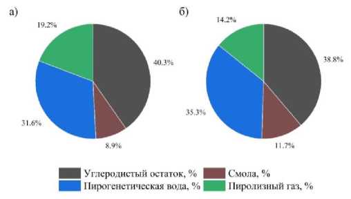 Fig. 3. Material balance of pine nut shell (а) and manure (б) pyrolysis