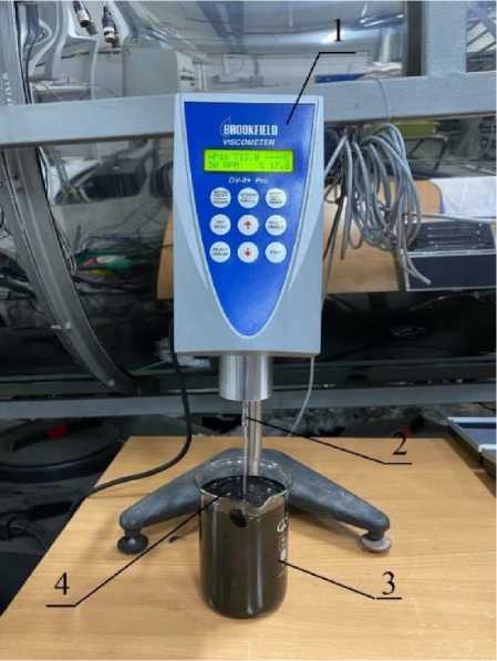 Рис. 1. Экспериментальная установка по измерению динамической вязкости ВУС (1 – ротационный вискозиметр; 2 – шпиндель; 3 – цилиндрический стеклянный сосуд с исследуемой суспензией; 4 – Био-ВУС)