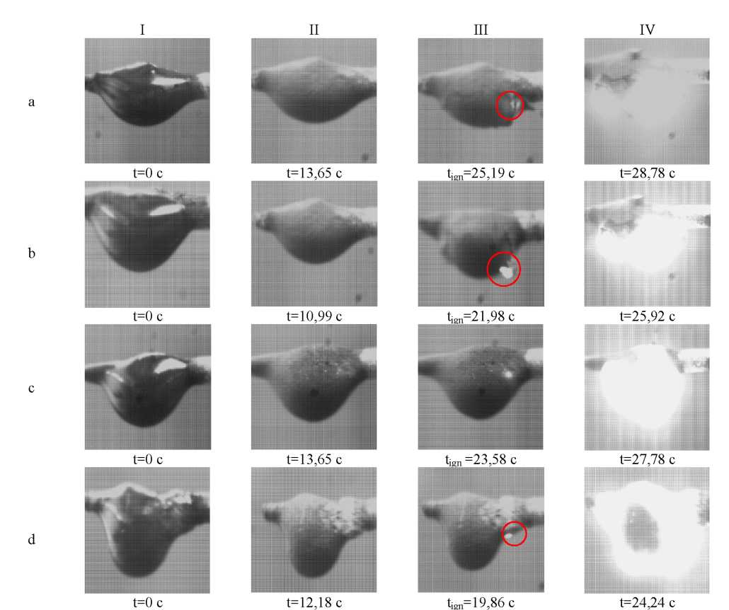 На рис. 5 представлена типичная видеограмма процессов зажигания капель ВУС без СВЧ-излучения (рис. 5, а, с) и под воздействием микроволнового нагрева (рис. 5, b, d). Процесс термической подготовки топлива можно условно разделить на несколько последовательных стадий. В начальный момент времени кадр I характеризует начало теплового воздействия, происходит инертный нагрев капли топлива, который инициирует процесс испарения влаги. Далее влага начинает испаряться, и топливо изменяет свою текстуру с блестящей на матовую (кадр II), образуется твердый углеродистый каркас. За кадр воспламенения частицы ВУТ с временем tign принимался момент начала светимости частицы, превышающей светимость камеры сгорания (кадр III). Стоит отметить, что зажигание, как правило, происходит на поверхности частицы. Кадр IV характеризует развитое горение частицы ВУС. С момента зажигания (кадр III) до развитого горения (кадр IV) для Био-ВУС с добавлением опилок сосны проходит почти столько же времени, что и для ВУС с добавлением хвои сосны при всех видах нагрева. Следовательно, можно сделать вывод, что вид биомассы в составе ВУС не влияет на время полного охвата пламенем капель Био-ВУС при температуре окружающей среды T=673 К.