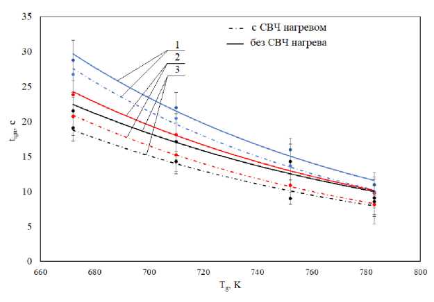 - Наибольшее влияние микроволнового нагрева наблюдается в области относительно низких температур (T≤700 К).