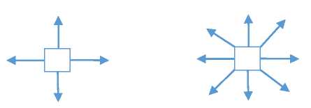 Рис. 4. Принципы связности точек в дискретном случае: четырехсвязность (слева) и восьмисвзяность (справа)