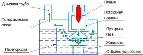 Аппараты погружного горения (АПГ) представляют собой теплотехнические устройства для прямого нагрева и выпаривания растворов. Нагрев раствора происходит при его непосредственном контакте со струёй горячих дымовых газов, образующейся в камере сгорания. Преимуществом такого способа нагрева является отсутствие теплопередающих поверхностей, на которых выпадают осадки солей [1]. При работе АПГ струя дымовых газов, контактируя с жидкостью, разбивается на пузырьки, которые барботируют через слой жидкости и отдают ей своё тепло. После выхода из барботажного слоя дымовые газы инвертируются в сплошную фазу и покидают аппарат через выхлопную трубу. Нагретая жидкая фаза переливается через порог, попадает в приёмную ёмкость и смешивается с новыми порциями жидкости, поступающими в АПГ. Жидкая фаза из приёмной ёмкости принудительно с помощью насоса подаётся в выпарную ёмкость, где происходит её нагрев и последующее выпаривание.