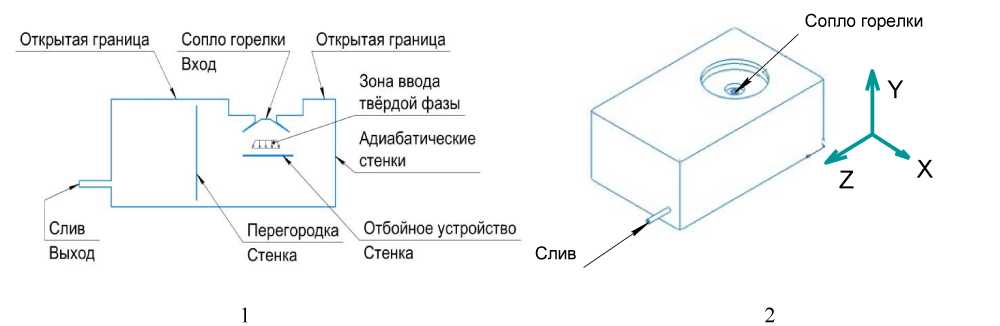 На рис. 2 представлена расчётная схема, использованная в настоящем исследовании. Так как процесс горения топлива не является предметом рассмотрения, горелка, как отдельный элемент, в схеме отсутствует. Собственно говоря, интерес представляет лишь поток дымовых газов.