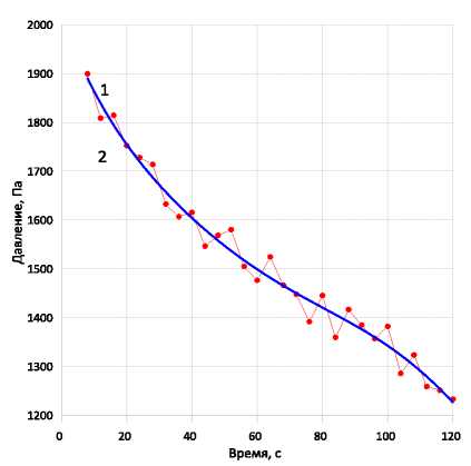 Рис. 15. Давление на срезе сопла: 1 – численные данные; 2 – линейная аппроксимация