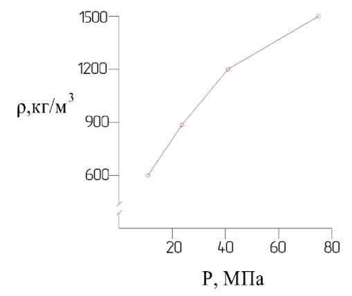Fig. 3. Dependence of the density of plant raw material granules on pressure during granulation