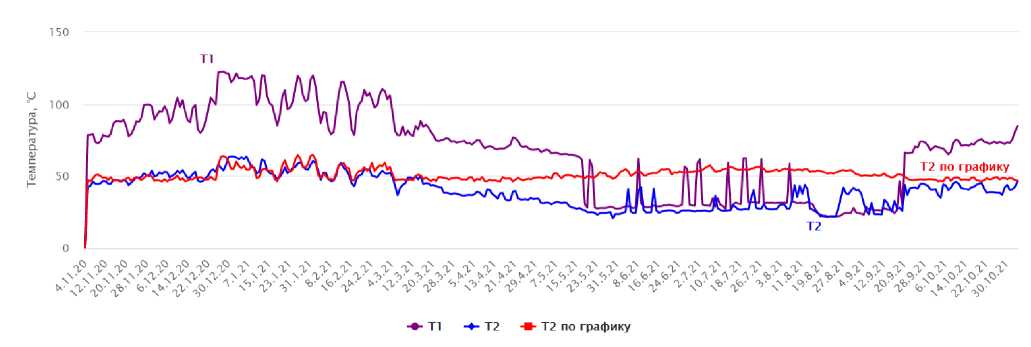Для выбранной системы теплопотребления представим анализ температурного режима. На рис. 2 приведены среднесуточные температуры подающего Т1 и обратного Т2 трубопроводов сезонной нагрузки (отопления и вентиляции), а также температура обратного трубопровода в соответствии с заданным графиком температур – Т2 по графику.