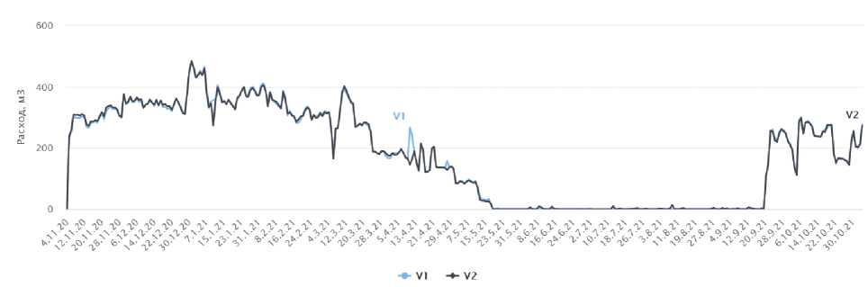 На рис. 4 представлен график расхода теплоносителя в подающей V1 и обратной V2 линии системы отопления и вентиляции здания. Из графика видно, что разница между расходом в подающем и обратном трубопроводах не превышает допустимую, при учете отсутствия теплопотребления в системе отопления и вентиляции в летний период.