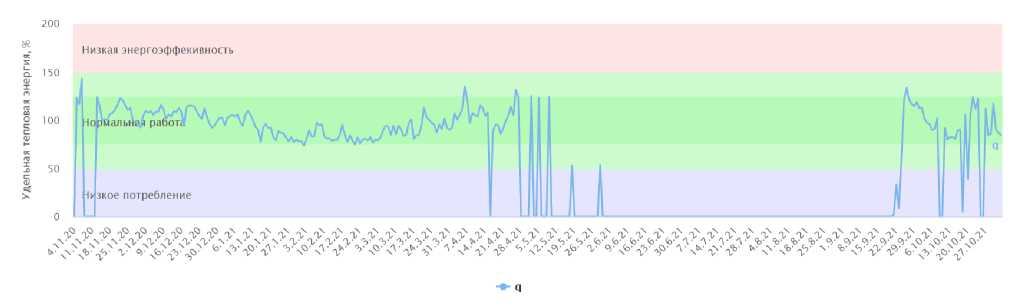 Разработанная система мониторинга и анализа параметров позволяет для каждого здания получить величину отклонения показателя удельного теплопотребления здания от некоторого «оптимального» потребления, что, в свою очередь, помогает при принятии решений по повышению эффективности энергоснабжения потребителей.