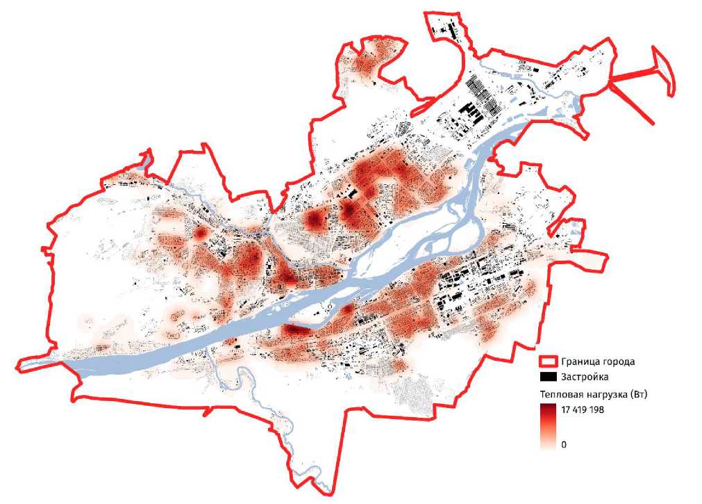 Картосхемы распределения тепловой нагрузки и плотности тепловой нагрузки демонстрируют, что наибольшая удельная тепловая нагрузка приходится на новые жилые районы высотного домостроения.