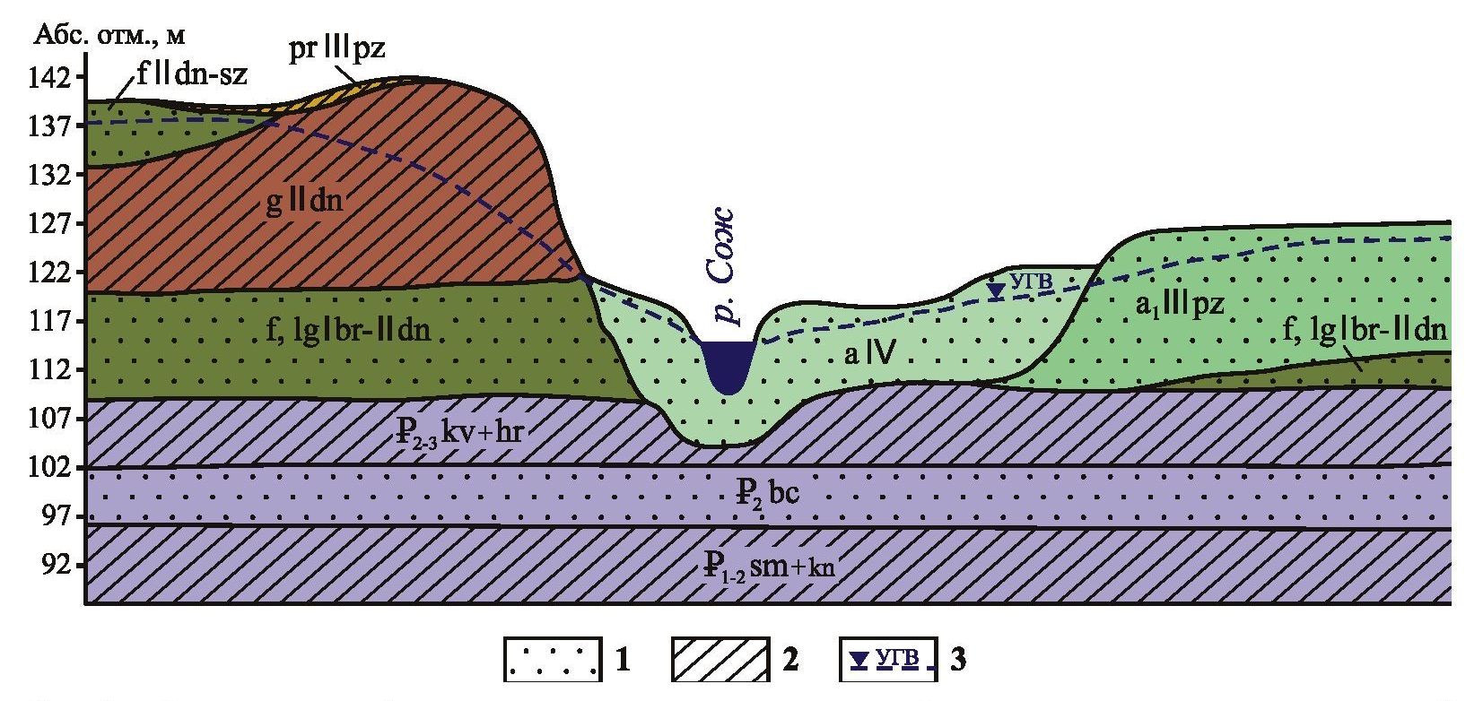 Fig. 1. Schematic section of the upper horizons of the platform cover of the territory of Gomel: 1) water-permeable rocks, 2) weakly permeable rocks 3) groundwater level