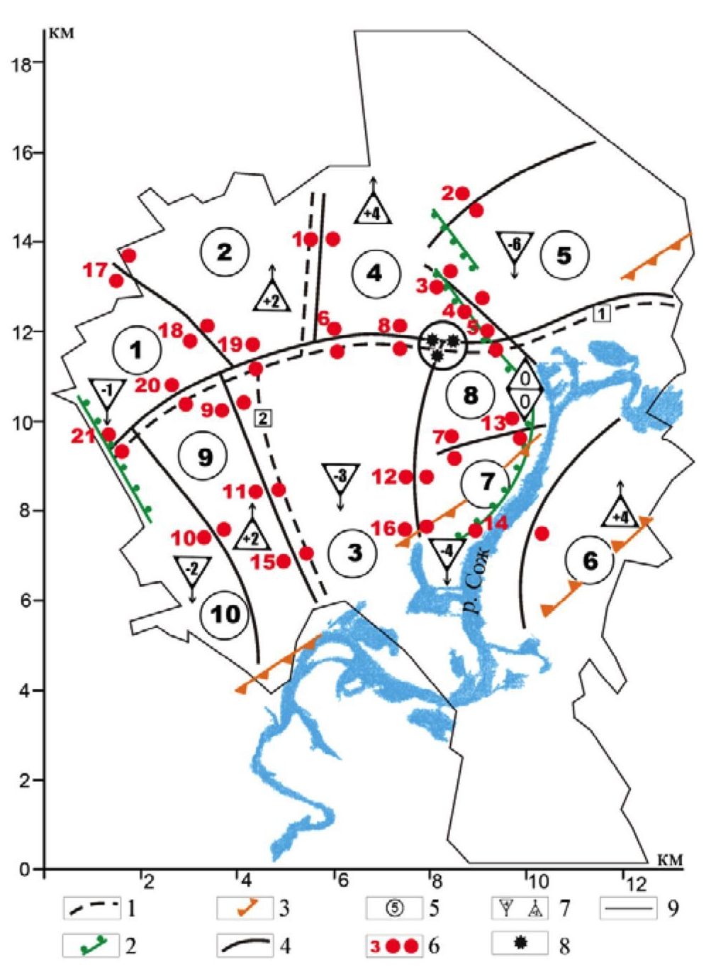 Fig. 2. Map-layout of the geo-active zones of Gomel: 1) tectonic disturbances established by geological data; 2) ring structure expressed in relief; 3) regional geo-active zone; 4) block boundaries; 5) block numbers; 6) adjacent pairs of deformation signs; 7) vertical speeds and directions of movement of blocks; 8) leveling signs of local research; 9) city border