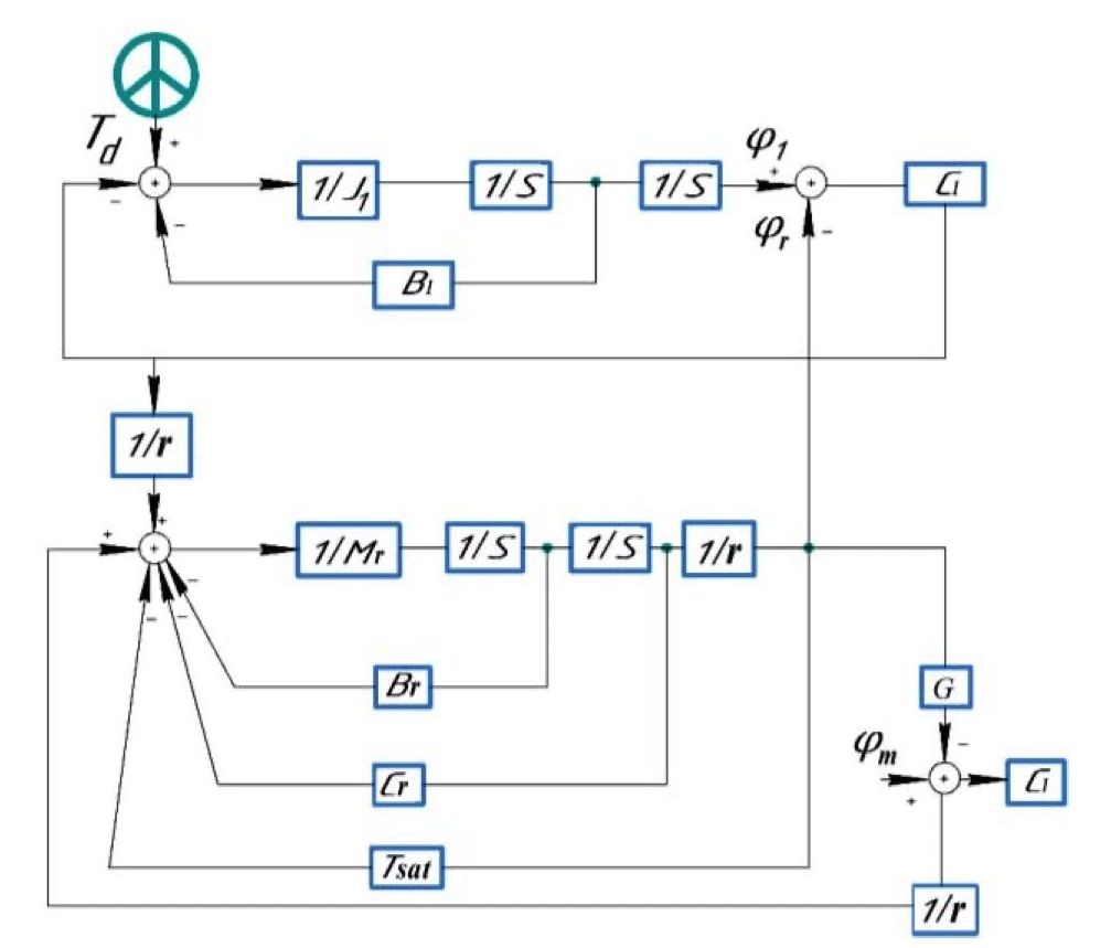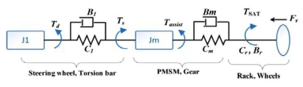 где J1, Jm – моменты инерции рулевого колеса и колонки, ротора двигателя; φ1, φm, φr – углы поворота рулевого колеса, вала двигателя и шестерни и рейки; Td, Ts, Tassist – крутящий момент от водителя, крутящий момент рулевого управления, измеренный датчиком крутящего момента, и крутящий момент электродвигателя; C1, Cm – крутильные жесткости рулевой колонки и вала электродвигателя; B1, Bm – коэффициенты демпфирования рулевой колонки и электродвигателя; Br, Cr – коэффициенты демпфирования стойки и жесткости пружин и шин; Fr, Tsat – сила трения системы рулевого управления и момент самовыравнивания системы ЭУР; Mr, G, r, x – масса рейки, передаточное число двигателя, радиус шестерни и смещение рейки.