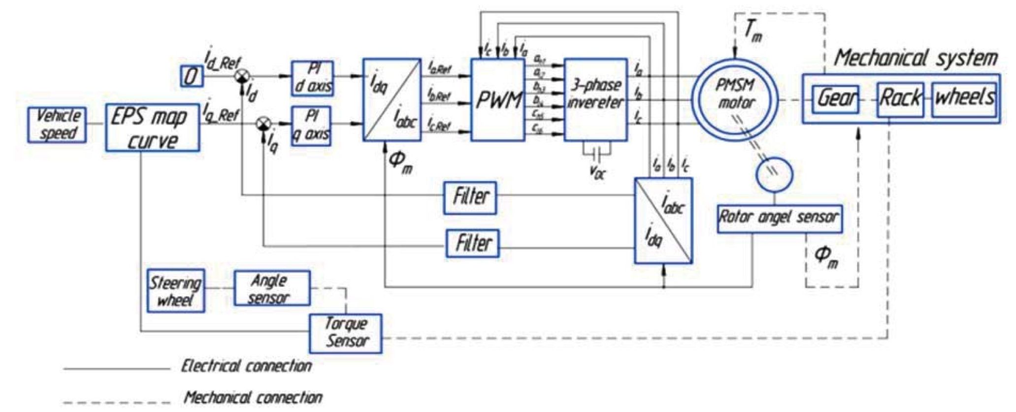 Сигналы управления электродвигателем в составе ЭУР формируются в электронном блоке управления (ЭБУ), содержащем контроллер и инвертор напряжения. Алгоритмы, реализуемые в ЭБУ, могут использовать различные принципы, например линейно-квадратичное гауссово управление (Linear Quadratic Gaussian – LQG) [7], нечеткое управление [8, 9] или робастный регулятор (H∞) [10]. Однако, как правило, пропорциональные интегральные (ПИ) регуляторы, имея простую структуру, могут эффективно решать задачу управления движением ТС при легкой схемотехнической реализации [11, 12].