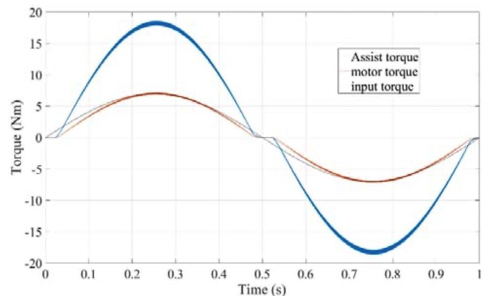 Fig. 11. Simulation results of the input driver torque, motor torque and assist torque at a vehicle speed of 40 Km/h