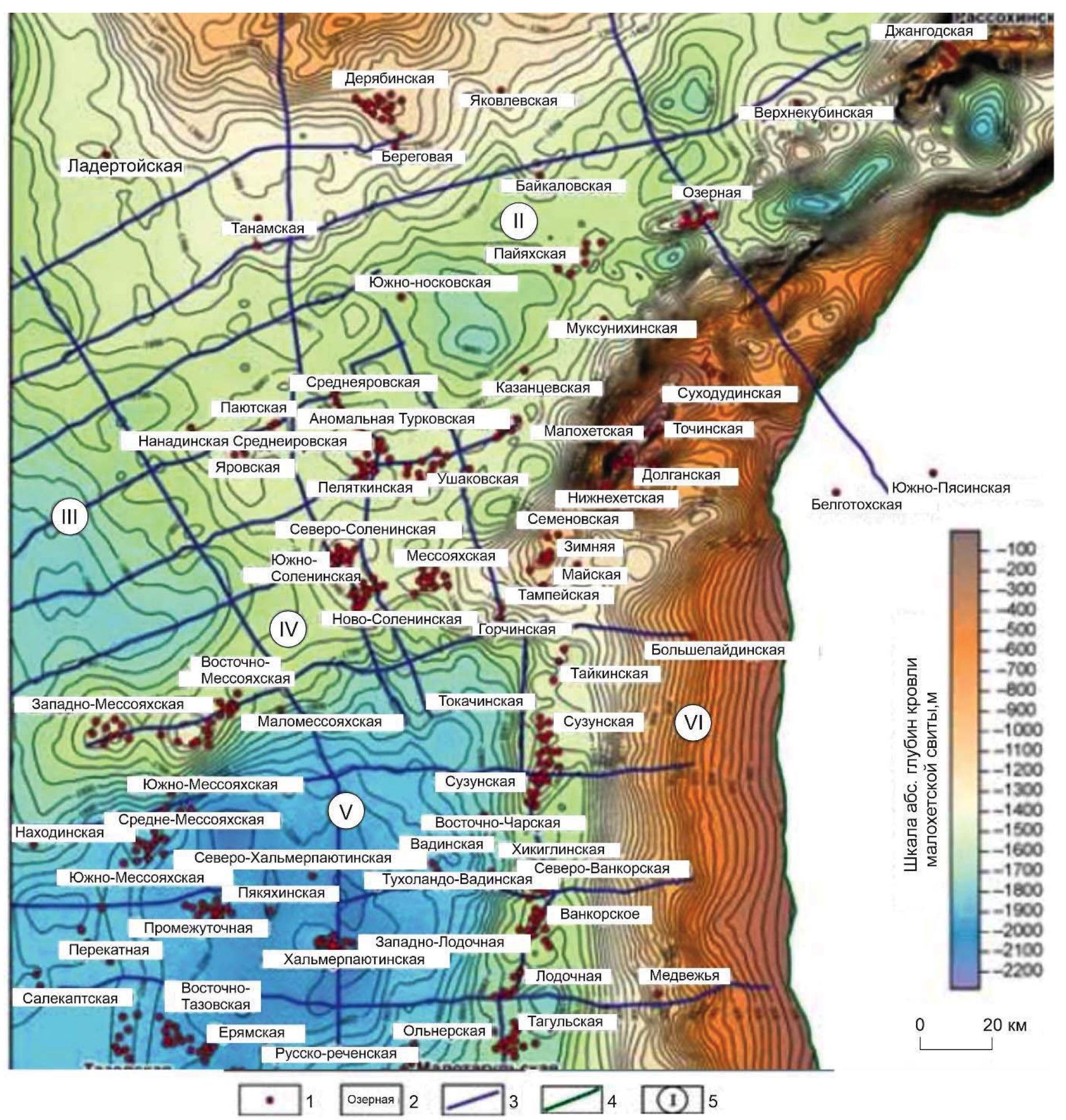 Fig. 2. Structural map of the study region for the roof of the Malokhetskaya Formation [5]: 1 – search and exploration wells; 2 – area names; 3 – seismic profiles of method CDP (common depth point method); 4 – boundary of the pinching-out zone of the Malokhetskaya Formation; 5 – supra-order tectonic elements: II – Taimyr anteclise, III – Antipayutinsko-Tadebeyakha syneclise, IV – Messoyakha ridge, V – Bolshekhetskaya megasyneclise, VI – Predyeniseiskaya megamonocline