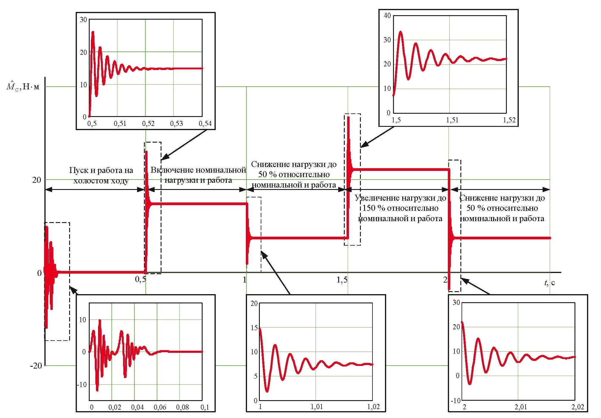 4. Проведена проверка работоспособности и эффективности наблюдателя при отработке изменяющейся нагрузки на валу двигателя. Выявлено, что разработанный наблюдатель при изменении нагрузки на валу, перегрузке и пуске в нагруженном состоянии получает устойчивые оценки угловой скорости ротора и момента сопротивления на валу погружного асинхронного двигателя. Интегральная погрешность оценки угловой скорости ротора относительно значений, полученных с помощью модели, составляет не более 1,2 %, что допустимо в системах управления погружными электродвигателями.
