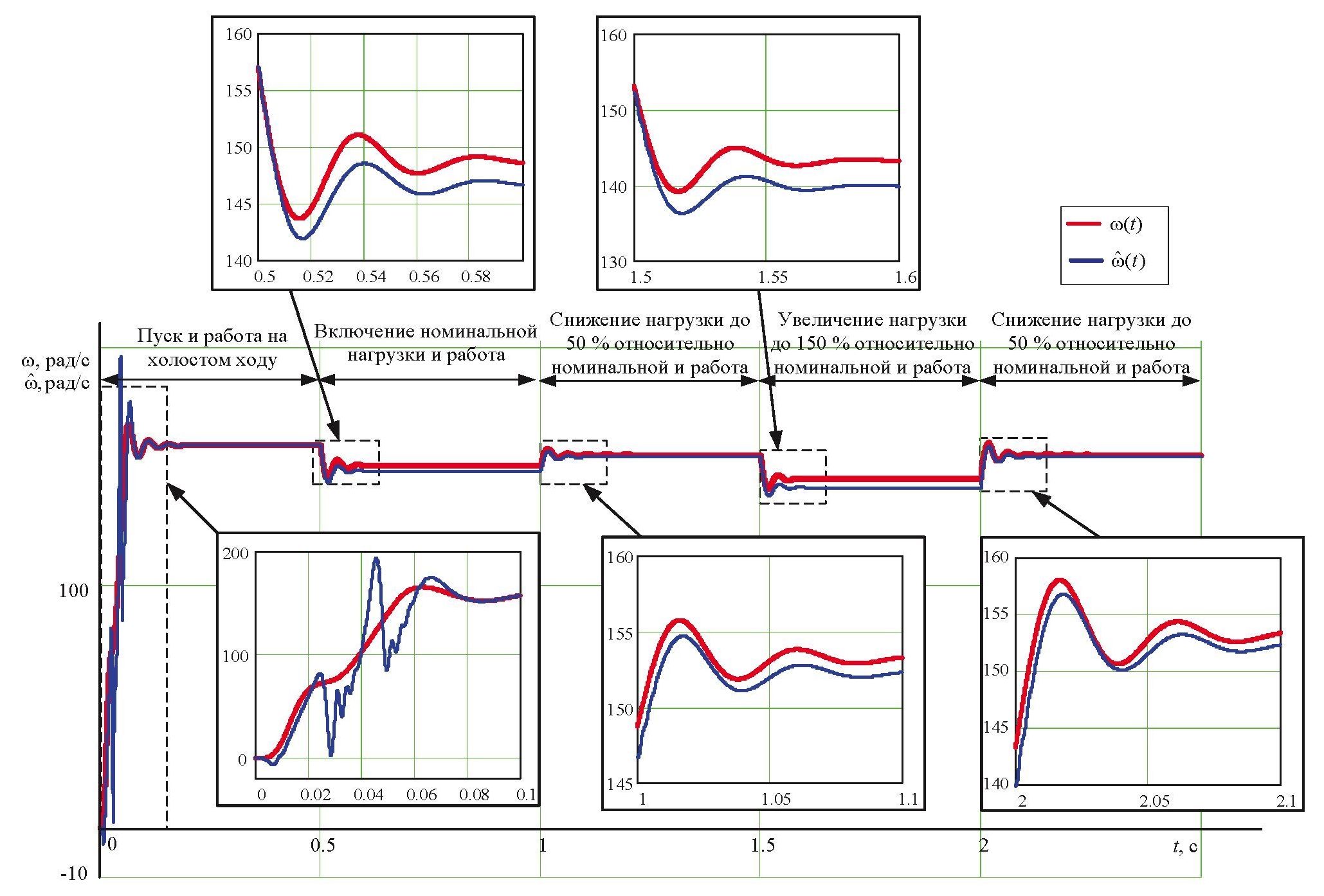 Одним из важных показателей устойчивости разработанного наблюдателя является способность отработки несогласованности начальных условий наблюдателя и реального процесса. Результаты моделирования угловой скорости ротора погружного электродвигателя в режиме пуска и оценок наблюдателя при несогласованности начальных условий приведены на рис. 2.
