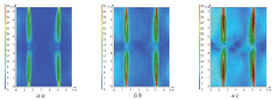 На рис. 2 представлены результаты моделирования интенсивности скоростного потока и векторное поле в продольном сечении топочной камеры, из которых видно, что с увеличением нагрузки наблюдается возрастание скорости потока. В частности, при нагрузке в 50 % скорость составляет от 2 до 5 м/с (рис. 2, а), соответственно, это препятствует эффективному перемешиванию топлива с воздухом и снижает теплообмен. Возрастание нагрузки приводит к большему заполнению восходящим потоком сечения топочной камеры, положительно влияя на снижение неравномерности потоков в целом по объему топочной камеры. При 100 % нагрузке скорость высокотемпературных продуктов сгорания составляет от 4 до 13 м/с (рис. 2, в), что усиливает теплообмен и способствует выгоранию пылеугольного топлива.