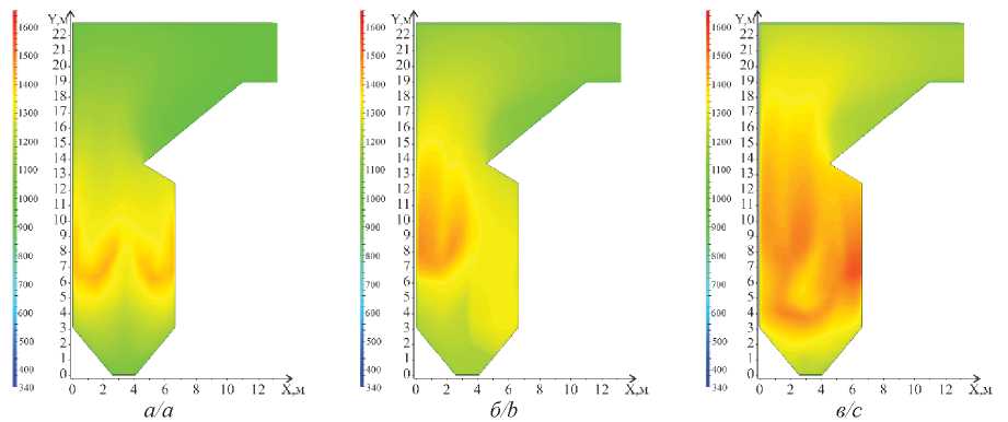 Рис. 5. Распределение температуры (К) в продольном сечении топочной камеры: а) нагрузка 50 %; б) нагрузка 80 %; в) нагрузка 100 %
