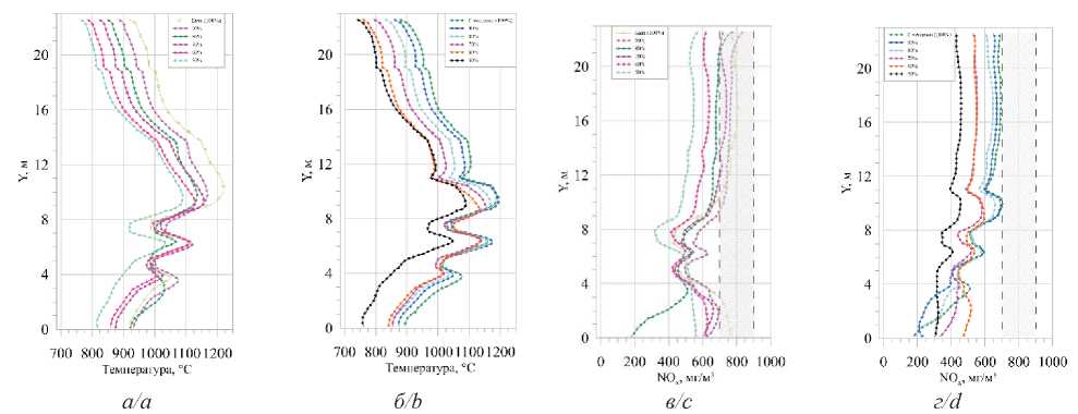 На рис. 7 представлены моделируемые температуры и концентрации NOx, усредненные по сечениям на различных высотах и при различных нагрузках котельного агрегата. В целом при рассмотрении профилей температур по высоте топочной камеры в базовом варианте и с установкой сопел третичного дутья можно отметить следующее: в нижней части топочной камеры наблюдается низкий уровень температур, который в дальнейшем с ростом высотной отметки увеличивается (рис. 7, а, б). На отметках расположения горелочных устройств и сопел третичного дутья наблюдается снижение температур вследствие поступления относительно холодных больших объемов топливно-воздушной смеси и воздуха. После аэродинамического выступа температуры снижаются вследствие теплообмена с ограждающими поверхностями.