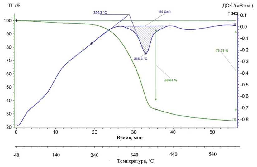 Согласно данным ДСК, результирующий тепловой эффект, наблюдающийся в области температуры 326,3 °С и выше, является эндотермическим и составляет 55 кДж/кг.