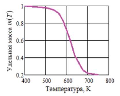 Рис. 8. Температурные зависимости удельной массы пиролизуемой пеллеты по данным ТГА, полученным авторами: кривая – расчетная зависимость с параметрами A и E (23); кружки – экспериментальные точки, снятые с кривой ТГА (рис. 2)