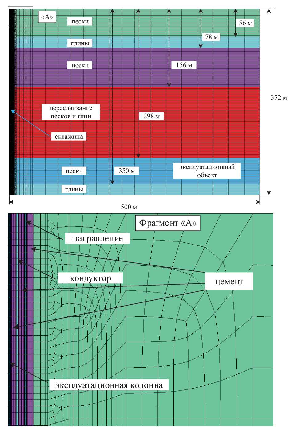 На рис. 2 представлена осесимметричная конечно-элементная схема, использованная для численного анализа поля распределения напряжений в околоскважинной зоне в процессе закачки ЖРО. Как видно из рисунка, в разрезе были учтены пласты, имеющие различные литологические свойства. Для каждого из выделенных интервалов задавались упругие свойства, приведенные в табл. 2, в которой также указаны интервалы разбиения модели по разрезу. В связи с тем, что отсутствовали данные об экспериментальных исследованиях упругих свойств пород в разрезе скважины, такие данные определялись на основе справочных данных [22–24] и на основе опыта моделирования подобных задач геомеханики авторов данной публикации. Так как деформации земной поверхности в наибольшей степени зависят от упругих свойств эксплуатационного горизонта, по данному пласту такие свойства адаптировались на основе результатов измерений деформаций геофизическим методом [2].