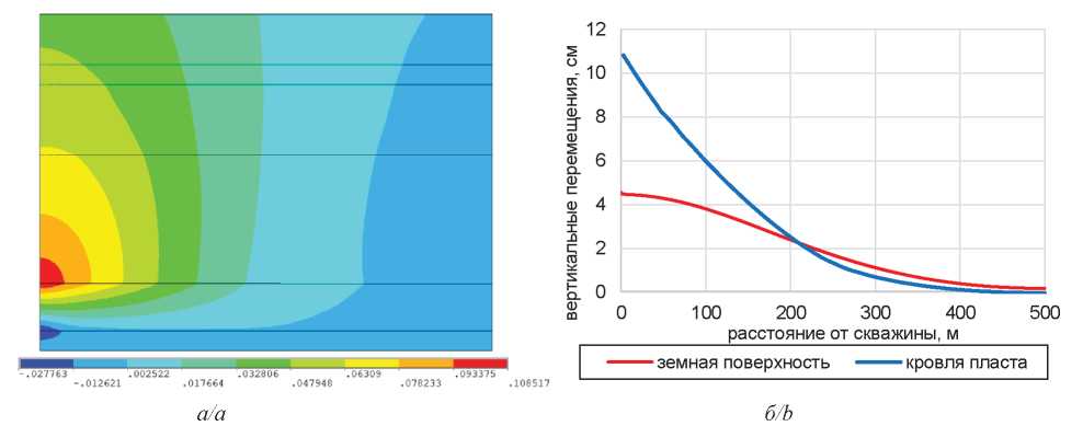 Рис. 4. Распределение вертикальных перемещений вблизи скважины по всему разрезу в метрах (а) (положительное направление вертикальной оси соответствует положительным вертикальным перемещениям), а также на уровне кровли эксплуатационного объекта и земной поверхности (б) при давлении на устье скважины 1,71 МПа