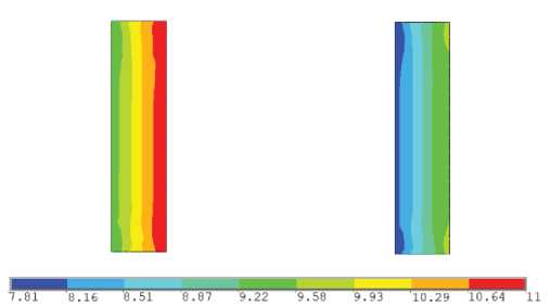 Согласно формуле (1), если коэффициент запаса прочности больше 1, цемент находится в сохранности, если данный параметр меньше 1, происходит его разрушение. На рис. 5 показано распределение коэффициента запаса прочности цементной крепи в эксплуатационной колонне на глубине 280 м. Как видно из рисунка, цементное кольцо на данной глубине обладает достаточно хорошей устойчивостью. Так, если закачка жидких радиоактивных отходов не осуществляется, коэффициент запаса прочности изменяется от 9,2 до 11, при этом максимальное его значение наблюдается на контакте цемента с породой, наименьшее – на контакте колонны и цемента.