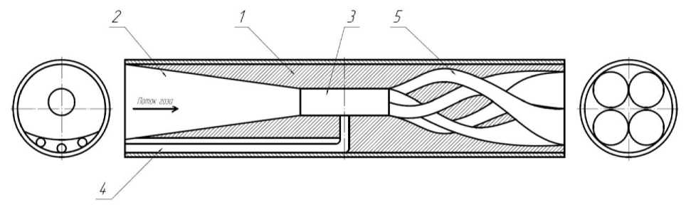 Рис. 5. Предлагаемое устройство (1 – корпус; 2 – входная часть; 3 – узкая часть; 4 – каналы для впрыскивания жидкости; 5 – турбулизирующие каналы)