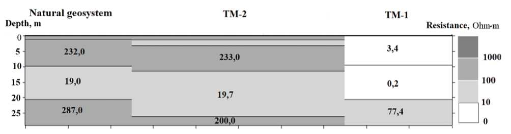 На основе выполненных ВЭЗ был построен геоэлектрический разрез (рис. 10). В фоновой геосистеме и на участке ТМ-2 верхняя часть геологической среды состоит соответственно из четырех и пяти слоев, различающихся по удельному электрическому сопротивлению. Верхний слой характеризуется высоким сопротивлением (400–500 Oм·м) и мощностью 1,1–1,3 м (соответствует песчаными почвам).