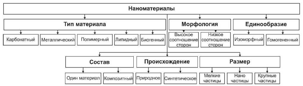 Рис. 10. Общая классификация наноматериалов с точки зрения типов материалов, состава, происхождения, размера, строения и агломерации [125, 126]