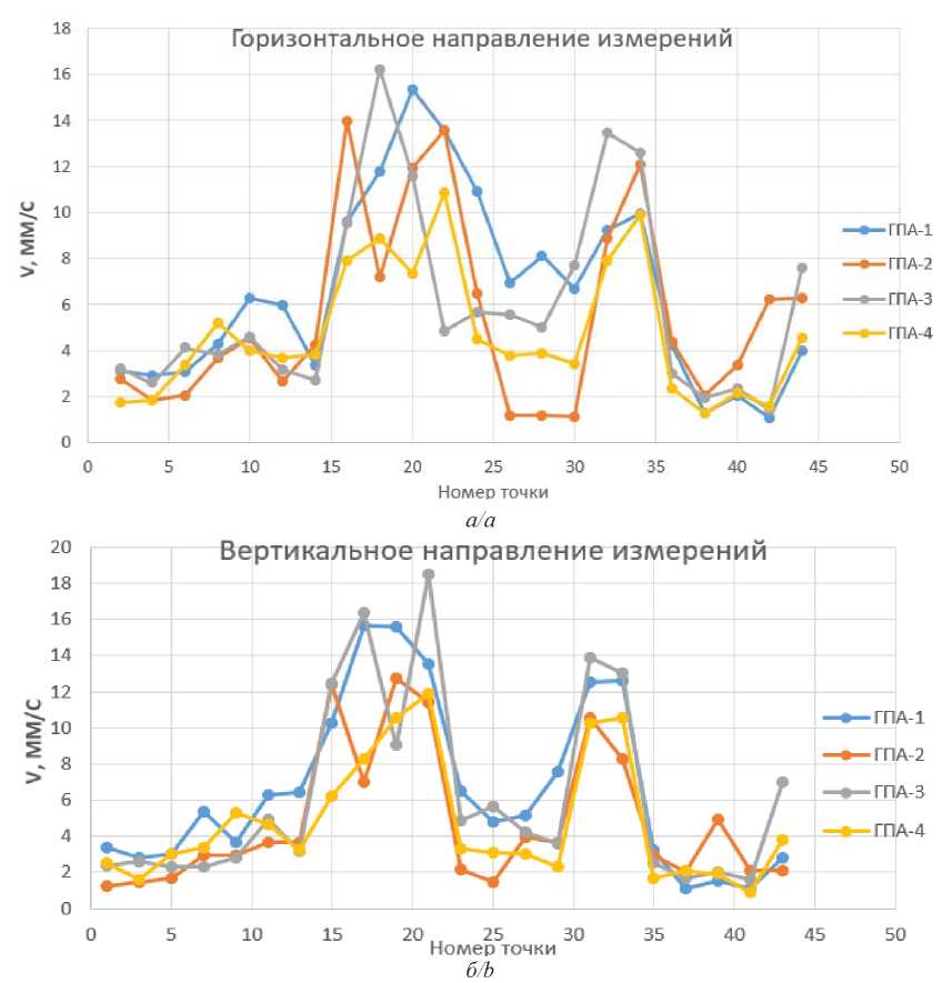При проведении анализа причин высокой вибрации дополнительно были исследованы вибрации ТПО. Согласно [28], значения частот колебаний, при которых анализируется вибрация трубопроводов, разделены на низкочастотное (НЧ) и высокочастотное (ВЧ). Были проведены замеры среднеквадратичных значений (СКЗ) виброскорости в характерных точках ТПО (рис. 1) четырех агрегатов, в НЧ (рис. 2) и ВЧ (рис. 3) диапазонах.