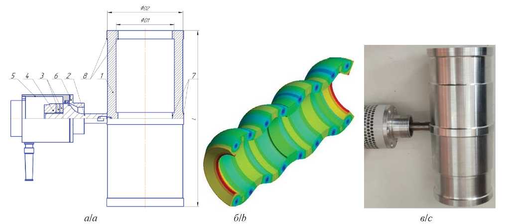 Для воздействия на газодисперсный поток в радиальном направлении был разработан трубчатый излучатель, выполненный в виде полого цилиндра, колеблющегося на изгибно-диаметральной моде колебаний. Излучатель одновременно служит внешним корпусом агломерационной камеры. Определение акустических и геометрических параметров и расчет формы колебаний излучателя осуществлялся при помощи модального анализа в системе конечно-элементного моделирования (пакет Ansys). На рис. 2 представлена полученная по результатам расчетов конструкция трубчатого излучателя и форма его колебаний. На рис. 3, в показано фото изготовленного излучателя. Разработанный излучатель формирует изгибно-диаметральные колебания по всей длине, что позволяет создать регулярную равно-амплитудную структуру колебаний большой протяженности. Поэтому протяженность такого излучателя ограничена только затуханием колебаний в материале излучателя, мощностью пьезоэлектрического преобразователя и механической прочностью узла присоединения излучателя к пьезоэлектрическому преобразователю.
