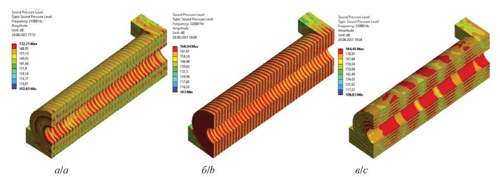 - При использовании трубчатого излучателя (рис. 6, в) формируется регулярная структура изменений ультразвукового поля, при этом средний уровень звукового давления составил 169 дБ, пиковые значения достигали 184 дБ. За счет изгибно-диаметральных колебаний трубчатого излучателя формируется кольцевая стоячая волна с множеством узлов колебаний (36 узловых областей) – 6 узловых кольцевых поверхностей в поперечном направлении и 6 узловых плоскостей в продольном направлении.