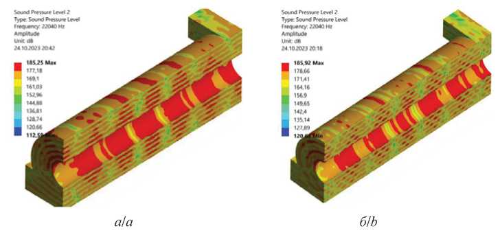 Рис. 6. Распределение уровня звукового давления в коагуляционной камере при совместном использовании различных типов излучателей: изгибно-колеблющегося и трубчатого излучателя (а), продольно-колеблющегося и трубчатого излучателя (б)
