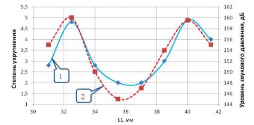 Fig. 7. Dependences of dispersed particles coarsening degree (curve 1) and sound pressure level (curve 2) on distance (L1) when using tubular radiator