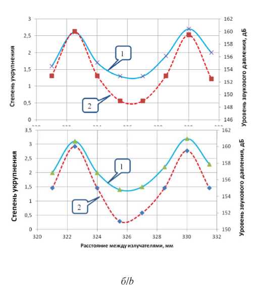 Рис. 8. Зависимости степени укрупнения дисперсных частиц (кривая 1) и уровня звукового давления (кривая 2) от расстояния (L) между продольно-колеблющимися (а) и дисковыми (б) излучателями